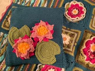 Can-crochet-anything artist is also writing poems for the choir to turn into songs. Here’s the latest work of art — a pillow.